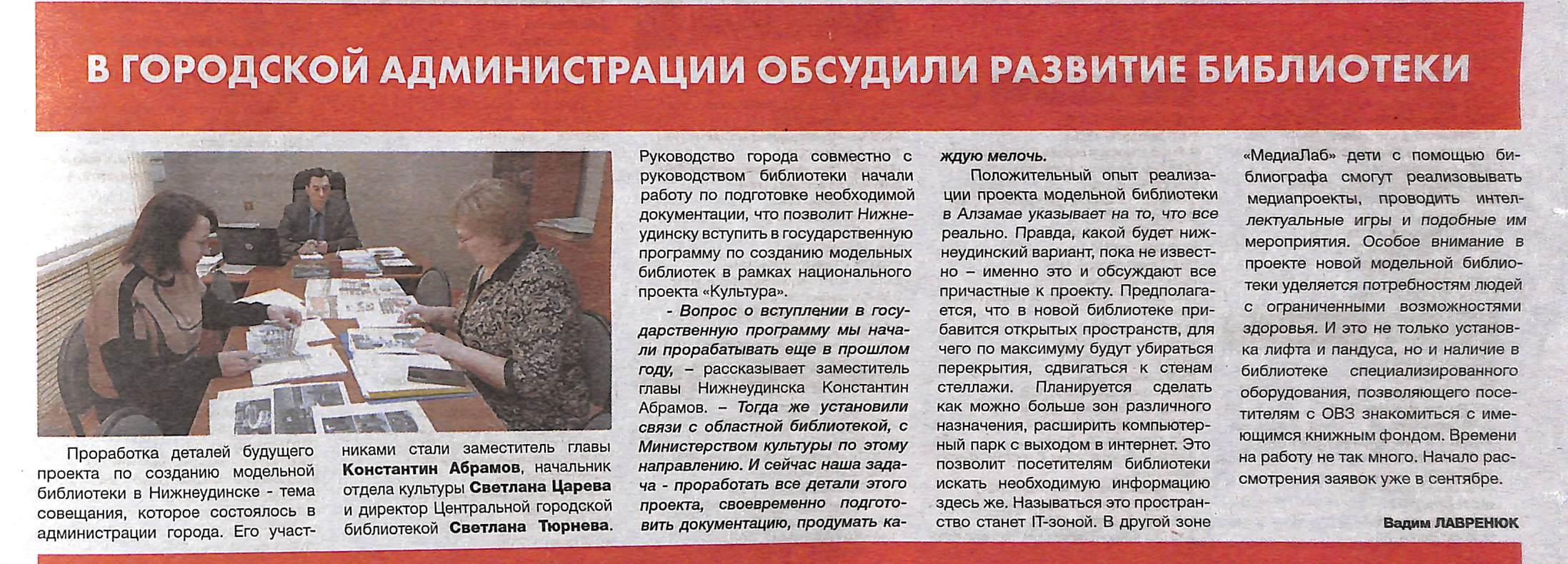2.Лавренюк, В. В городской администрации обсудили развитие библиотеки/Вадим Лавренюк// Наше время Нижнеудинск. - 2025. -07 февраля (№4). – С.7. скачать